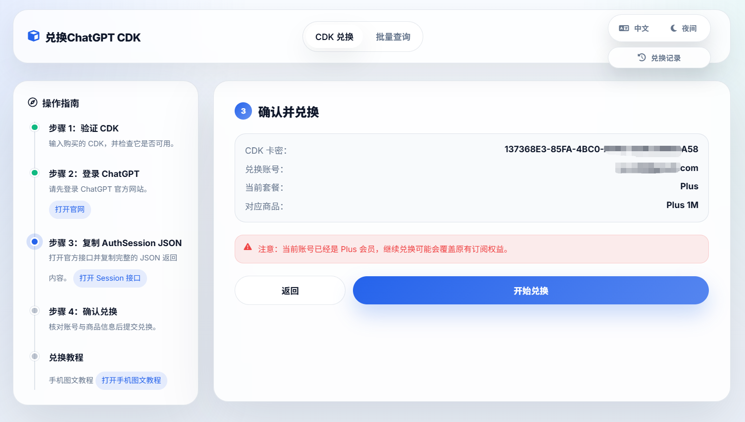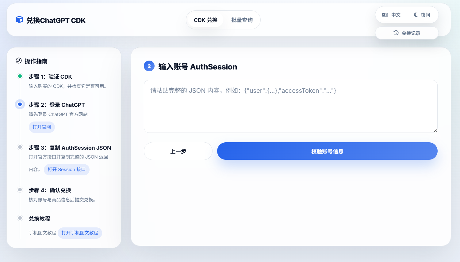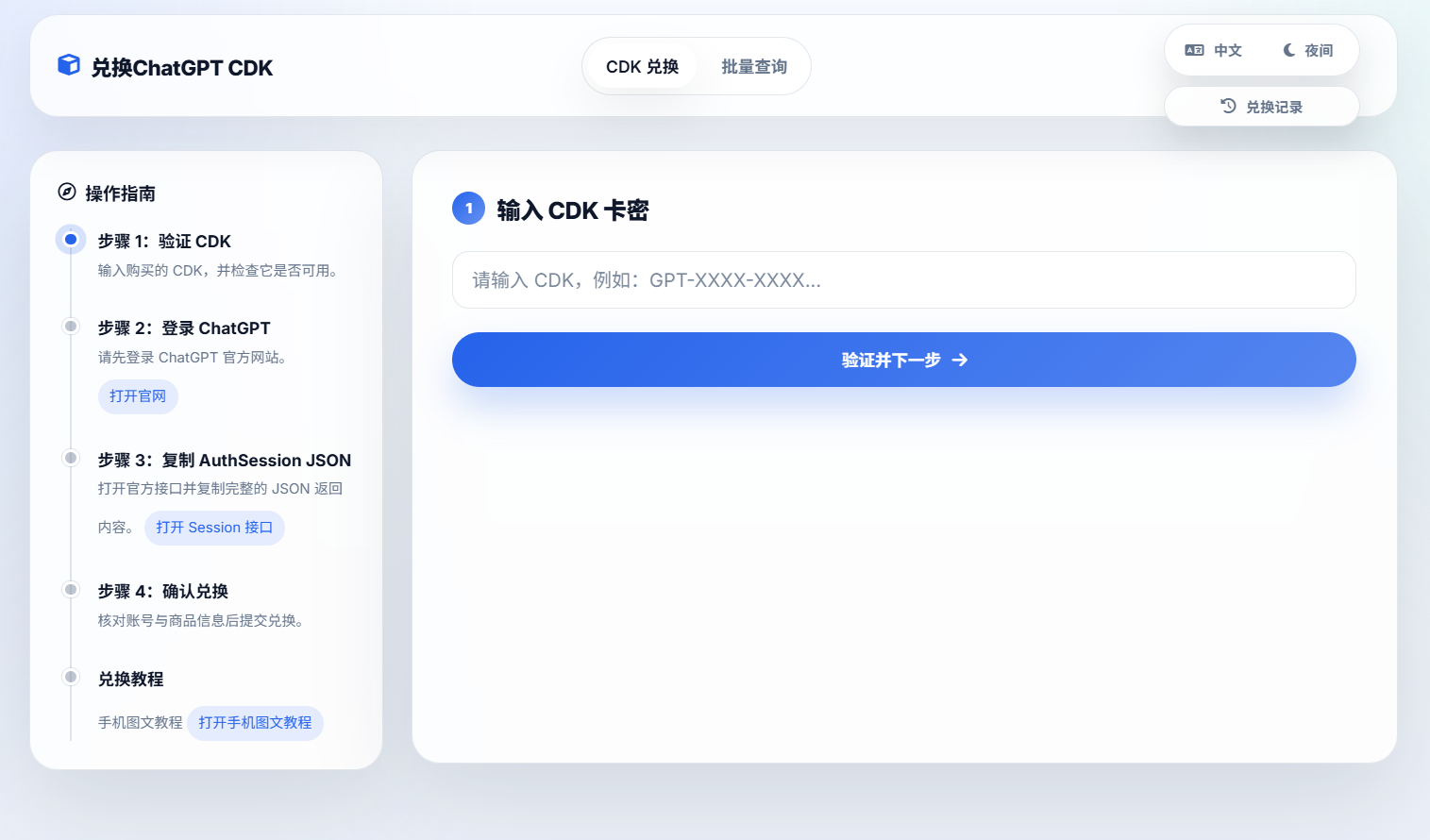 这份页面按电脑浏览器的阅读方式重新整理过,适合在桌面端按顺序完成卡密验证、登录 ChatGPT、复制 Session JSON 和确认兑换。